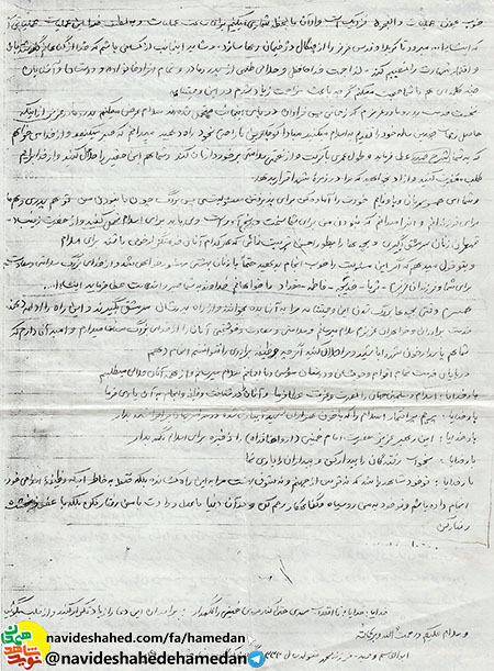 به تو قول مى دهم اگر اين مسئوليت را خوب انجام بدهيد حتما با زنان بهشتى محشور خواهى شد و از خداى بزرگ سلامتى و سعادت براى شما و فرزندان عزيزم ثريا ، خديجه ، فاطمه و مقداد را خواهانم .