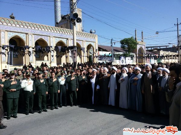 علما و روحانیون، فرماندهان نظامی و انتظامی و جمعی از مدیران و مسئولین استانی در کنار مردم شهید پرور کرمانشاه، حاضرین در این مراسم تشییع هستند.