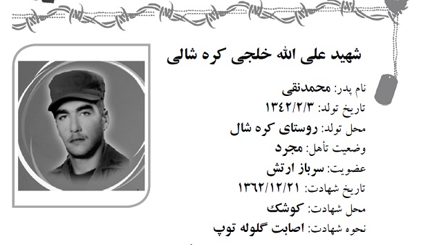 شهید علی الله خلجی کره شالی در وصیتنامه خود خطاب به مادرش میگوید: زیاد گریه نکن چون من شهید نشدم بلکه زندهام.