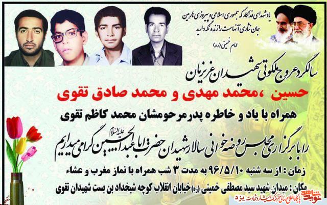 نوید شاهد یزد: سالگرد شهیدان حسین ، محمد مهدی و محمدصادق تقوی به همراه یاد و خاطره پدر مرحومشان محمد کاظم تقوی برگزار می شود.