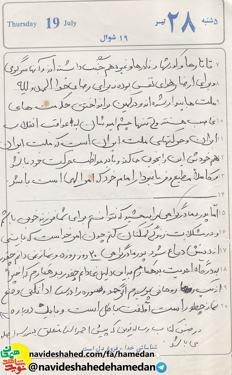 اما پدر و مادر گرامي، من را ببخشيد که نتوانستم براي شما فرزند خوبي باشم و در مشکلات زندگي کمکتان کنم چون امر خداست که بايستي از دينش دفاع شود. از تمام خويشان و دوستان و از تمام مردم برايم حلالي بخواهيد و از شما مي خواهم که برايم گريه و شيون نکنيد.