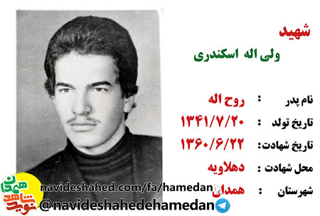 ولی الله اسکندری بیستم مهر ماه سال 1341 در روستای مزدقینه از توابع شهرستان همدان و در خانواده ای روستایی و ساده زیست به دنیا آمد. پدرش آقا روح الله کشاورز بود و با کار کردن بر روی زمین کشاورزی و باغداری مخارج خانواده پر جمعیت خود را تامین می کرد.