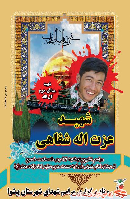 راسم تشییع پیکر شهید مدافع حرم شهید عزت اله شفاهی روز پنجشنبه بیست وهفتم مهر ماه ساعت 10 صبح ازمیدان امام(ره) به سمت صحن مطهر امامزاده جعفر(ع)پیشوا برگزارمیگردد.