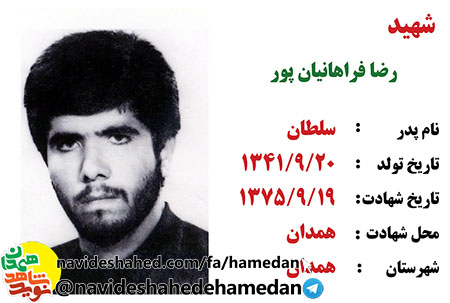 شهید رضا فراهانیان پور بیستم آذر ماه سال 1341 در روستاي انجلاس از توابع شهرستان همدان به دنیا آمد. فقط از سواد خواندن و نوشتن برخوردار بود و تحصیلات ابتدایی داشت. از همان کودکی مشغول کار شد و شغل خیاطی را برای خود انتخاب کرد.