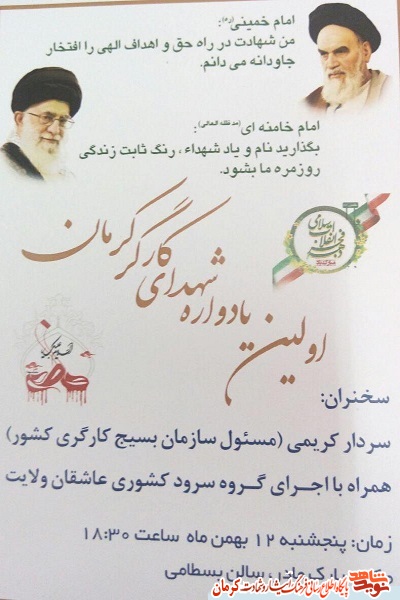 اولین یادواره شهدای قشر کارگری کرمان، با حضور سردار کریمی مسئول سازمان بسیج کارگری کشور برگزار خواهد شد.