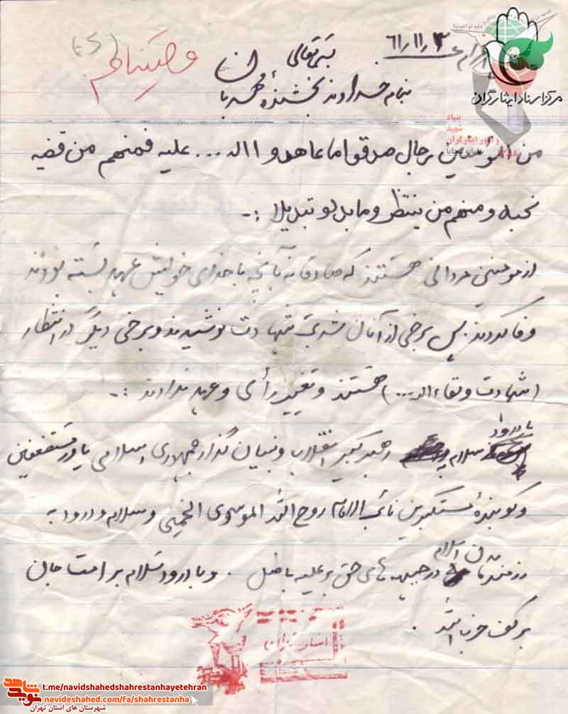 ... از برادران و دوستانم اين است که در جبهه هاي حق بر عليه باطل شرکت کنند و نگذارند که خون هاي شهيدان ما پايمال شود و بايست که حسين وار شهيد شويم که تا دست دشمن را از ايران اسلامي کوتاه کنيم.