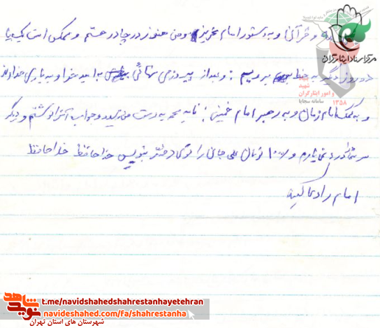 و تو اي همسر عزيزم اميدوارم به بچه ها محبّت كنيد و آنها را درست تربيت كني كه براي حامه اسلامي مفيد باشند و براي من ناراحت نباش چون اين راهي بود كه من انتخاب كردم راهي براي الله و قرآن و به دستور امام عزيز و من هنوز در چادر هستم و ممكن است يك يا دو روز ديگر به خط برويم : و بعد از پيروزي نهائي به اميد خدا و به ياري خداوند و به كمك امام زمان و به رهبر امام خميني : نامه محمد به دست من رسيد و جواب آنرا نوشتم و ديگر سر شما را درد نمي يارم . خداحافظ خداحافظ