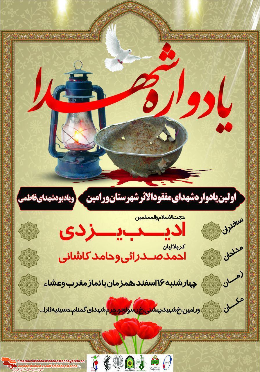 اولین یادواره شهدای مفقوالاثر و یادبود شهدای فاطمی با سخنرانی «حجت الاسلام والمسلمین ادیب یزدی» و مداحان؛ «احمد صدرائی» و «حامد کاشانی» در روز چهارشنبه شانزده اسفند ماه، همزمان با نماز مغرب و عشا واقع در خیابان شهید بهشتی، خیابان رسول جو، حرم شهدای گمنام، حسینیه ثارالله در شهرستان ورامین برگزار می شود.