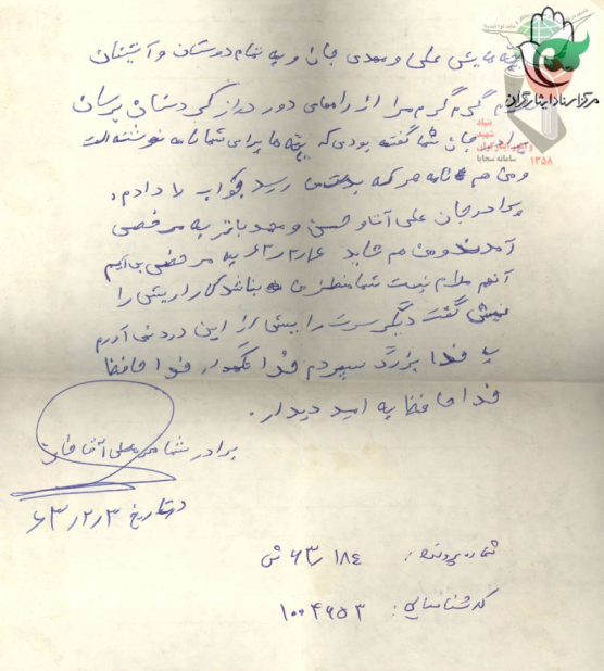 سلامهای گرم و صمیمانه خویش را از راههای دور با محبت های نزدیک خدمت برادر عزیزم آقا محمد آقاخانی تقدیم میکنم امیدوارم توفیق و سلامتی همگان را از خداوند متعال خواستارم. برادر جان حال که این نامه را مینویسم درست ساعت هفت و سی و پنج دقیقه شب مورخ سوم اردیبهشت 1363 بیاد شما عزیزان قلم در دست گرفته و آهنگ دل را روی ورقه سفید به نمایش میگذارم.