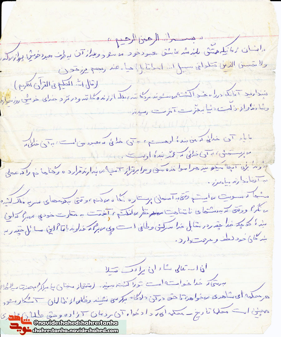 و پدر و مادر عزیزم مبادا شیطان صبرتان را از بین ببرد ، زاهد باشید که بی رغبتی به زندگی دنیاست . و انشاءا... که بنده ی حقیر را حلال می کنید.