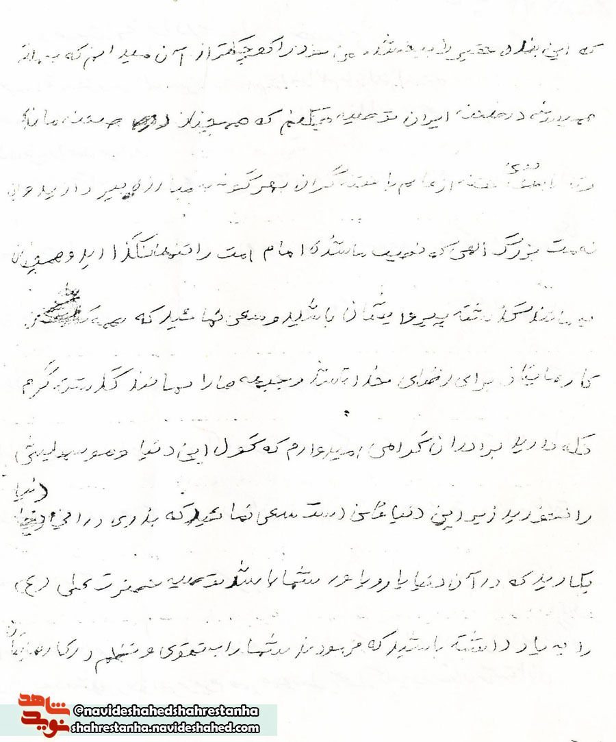 سلام بر پدر و مادر عزيزم اميدوارم كه اين فرزند ناقابل خود را حلال نموده و برايم هميشه نزد خداى مهربان دعا كنيد و از رفتن من هيچگونه ناراحتى به خود راه ندهيد بلكه افتخار هم بكنيد كه اين امانت الهى را خوب به مقصد رساندهايد.
