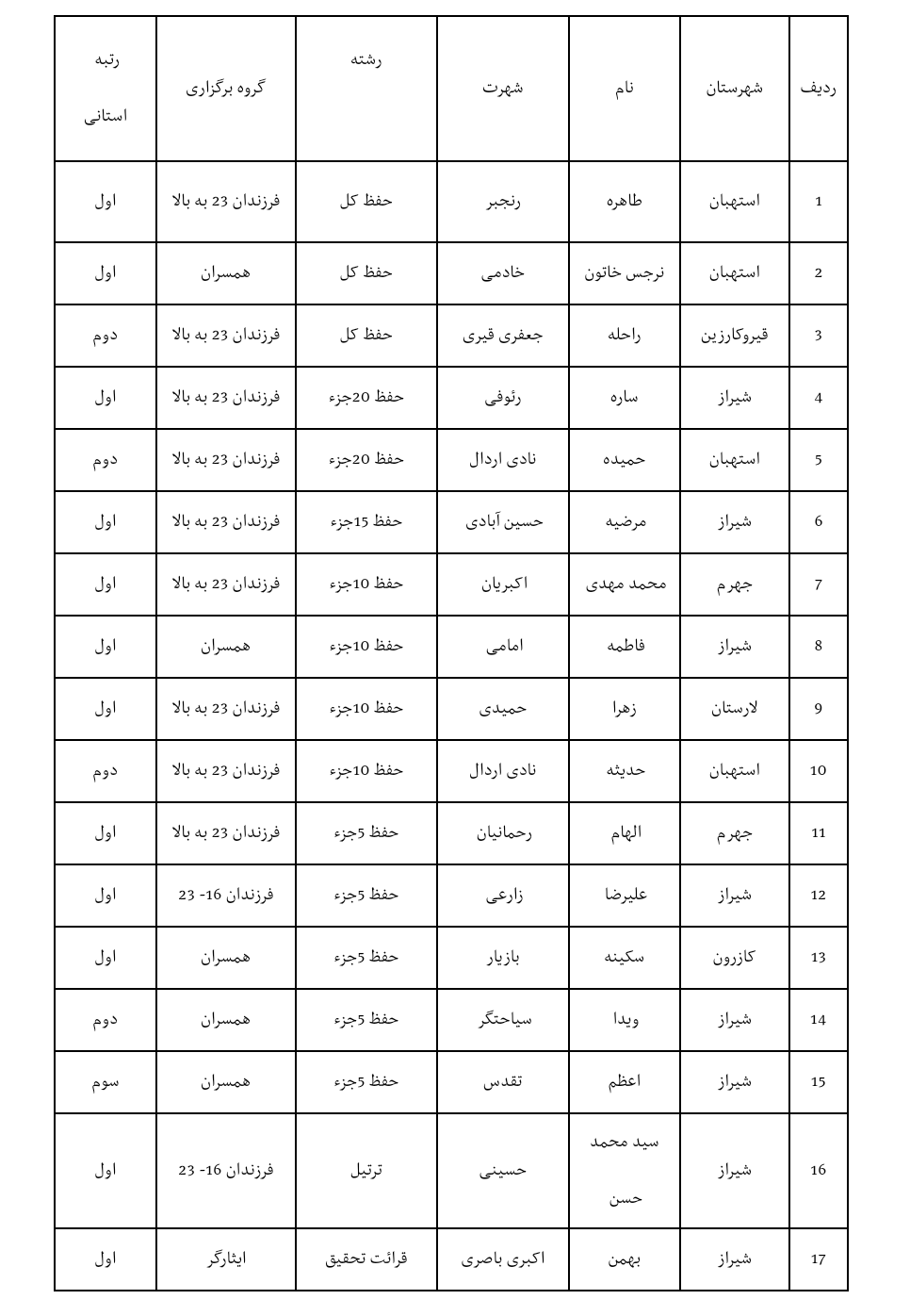 نفرات برتر این دوره از مسابقات در رشته حفظ و قرائت به شرح ذیل می باشد: