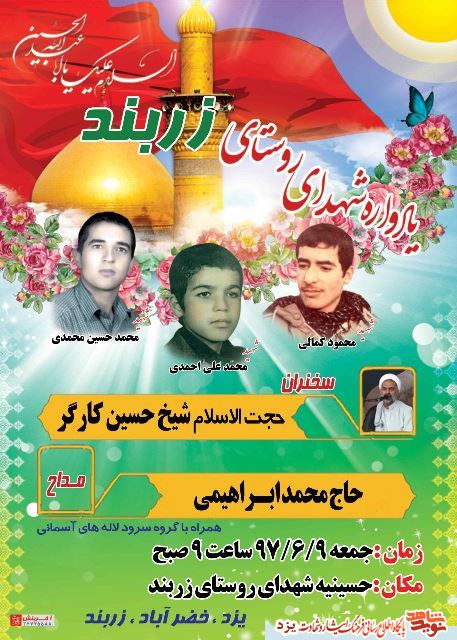 یادواره شهیدان محمودکمالی،محمدعلی احمدی و محمدحسن محمدی روز جمعه نهم شهریور ماه در روستای زربند برگزار می شود