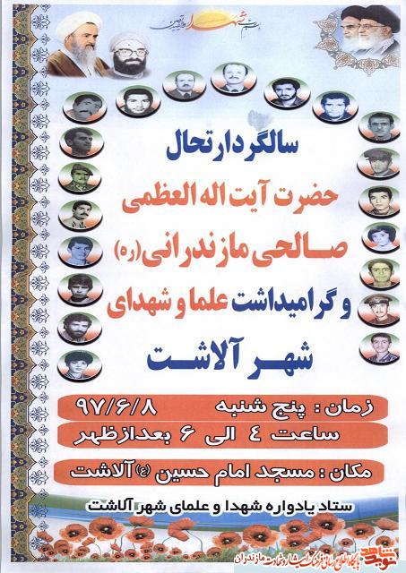 مراسم گراميداشت علما و شهداى شهر آلاشت سوادكوه؛ پنجشنبه هشتم شهريور 97 در اين شهر برگزار مى شود.