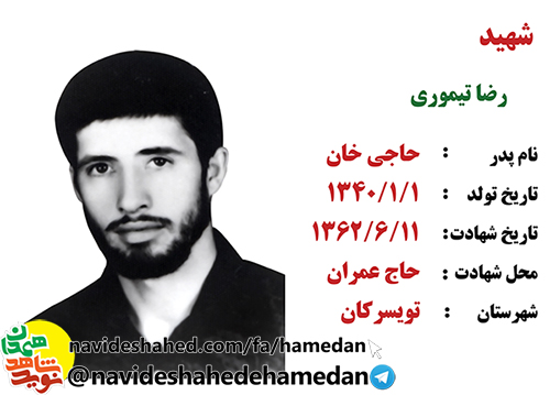 شهید رضا تیموری یکم فروردین ماه سال ۱۳۴۰ در روستای باباپیرعلی شهرستان تویسرکان از توابع استان همدان و در خانوادهای کشاورز و سادهزیست به دنیا آمد. پدرش حاجی خان کشاورز بود و با کار بر روی زمین کشاورزی و باغداری مخارج زندگی را تامین میکرد و تلاش داشت با تامین روزی حلال فرزندان خود را با طینتی پاک پرورش دهد.