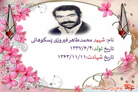 به گزارش نوید شاهد از زنجان، محمدطاهر فیروزی پسکوهانی چهارم شهریور ۱۳۳۷، در روستای کره چال از توابع شهرستان خدابنده به دنیا آمد. پدرش اسماعیل، کارگر بود و مادرش رقیه نام داشت. تا پایان دوره متوسطه درس خواند و دیپلم گرفت. سال ۱۳۵۷ ازدواج کرد و صاحب دو پسر شد. به عنوان پاسدار در جبهه حضور یافت. یازدهم بهمن ۱۳۶۳، با سمت آشپز در جزیره مجنون عراق بر اثر اصابت ترکش به پا، پهلو و دست، شهید شد. مزار او در روستای پسکوهان تابعه شهرستان زادگاهش واقع است.