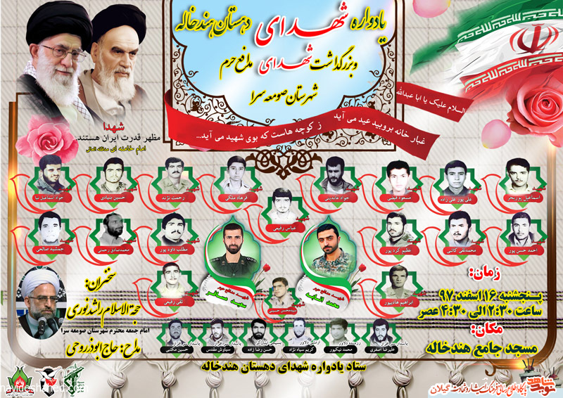 یادواره شهدای دهستان هندخاله و بزرگداشت شهدای مدافع حرم شهرستان صومعه سرا برگزار می شود.
