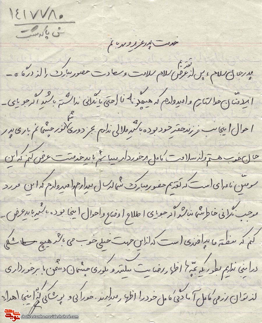 پدرجان سلام ، پس از تقديم عرض سلام سلامت و سعادت حضور مبارك را از درگاه ايزد منان خواستارم و اميدوارم كه هيچ گونه ناراحتي يا نگراني نداشته باشيد اگر جوياي احوال اينجانب فرزند حقير خود بوده باشيد ملالي ندارم بجز دوري شما نور چشمانم باري پدر جان خوب هستم و از سلامت كامل برخوردار مي باشم بايد خدمتت عرض كنم كه اين سومين نامه اي است كه تقديم حضور مبارك شما ارسال مي دارم و اميدوارم كه اين موردموجب نگراني خاطر شما نباشد اگر جوياي اطلاع اوضاع و احوال اينجا بوده باشيد بايد عرض كنم.
