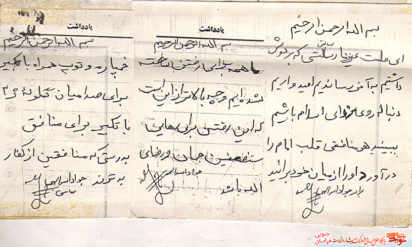 نوید شاهد - گزیده ای از دستونشته شهید والامقام "جواد اسداللهی" منتشر میشود. وی روز یکم آبان ماه 1341 در روستای چک نوزاد از توابع شهرستان درمیان متولد و بیست و دوم تیرماه 1360با ترکش خمپاره مزدوران بعثی در منطقه عملیاتی مهران به فیض شهادت نایل آمد.