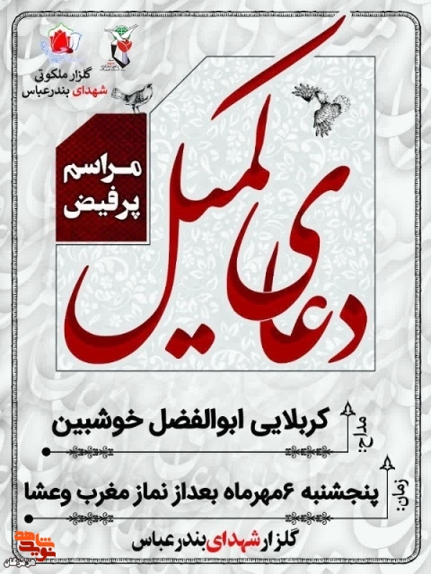 مراسم پرفیض دعای کمیل در گلزار ملکوتی شهرستان بندرعباس روز پنجشنبه 6 مهر ماه بعد از نماز مغرب و عشا برگزار میشود.