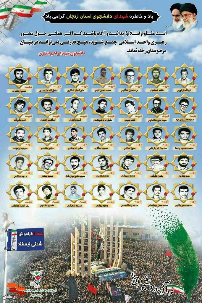 در زنجان، روز دانشجو نماد جاودانه ای از آمیختگی علم و شهادت است؛ روزی که یاد دانشجویان آگاه و انقلابی این دیار را گرامی می داریم که نور دانش را با شجاعت مبارزه درهم آمیختند. در این سرزمین، دانشجو تنها جوینده کتاب نبود، که در راه وطن، جوهر وجود خود را بر صحیفه تاریخ نگاشت. 16 آذر ماه مصادف با روز دانشجوست که به مناسبت این روز پوستر شهدای دانشجوی استان زنجان منتشر می شود.