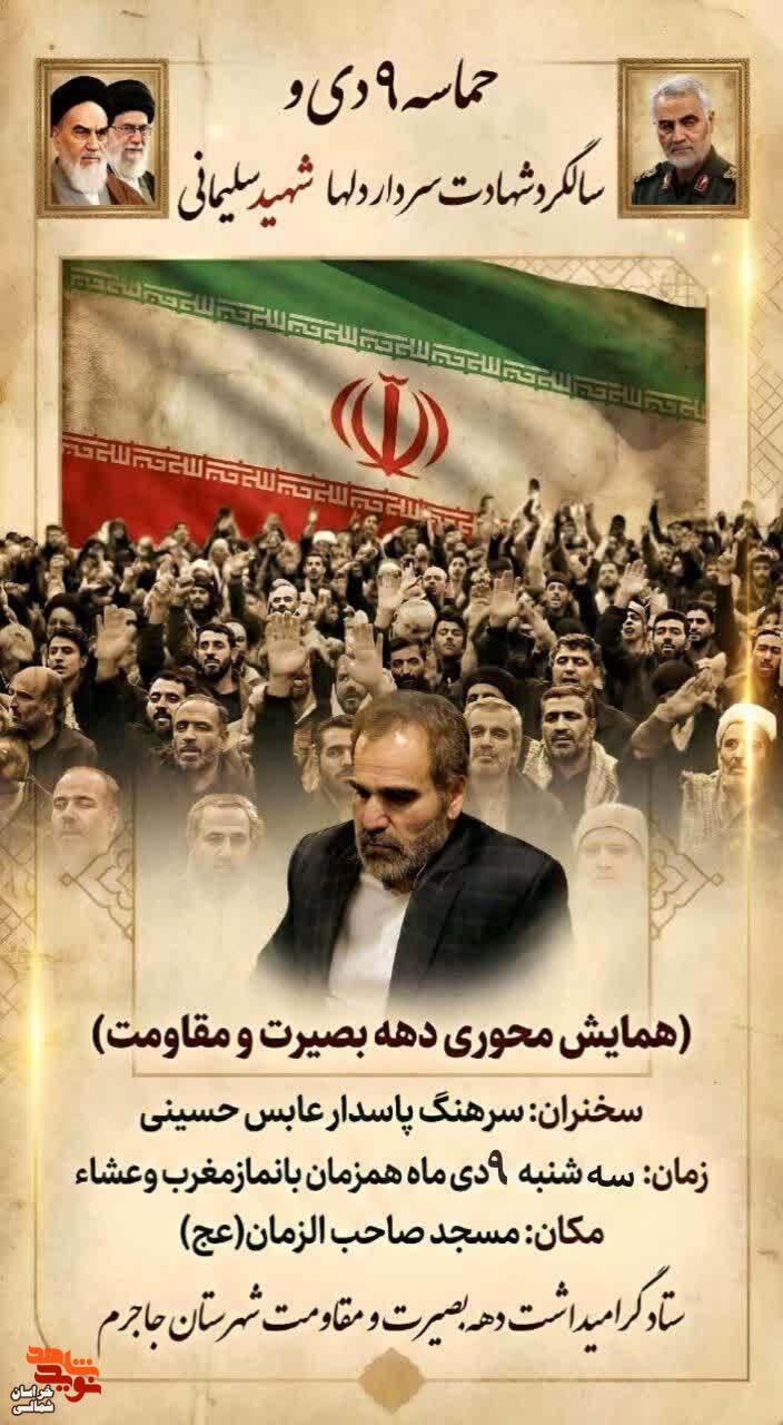 چهارشنبه دهم دی ماه ۱۴۰۴، مراسم حماسه ۹دی و سالگرد شهادت سردار دلها شهید «قاسم سلیمانی» با سخنرانی سرهنگ پاسدار سیدعابس حسینی همزمان با نماز مغرب و عشاء در مسجد صاحب الزمان (عج) شهر جاجرم برگزار میشود.