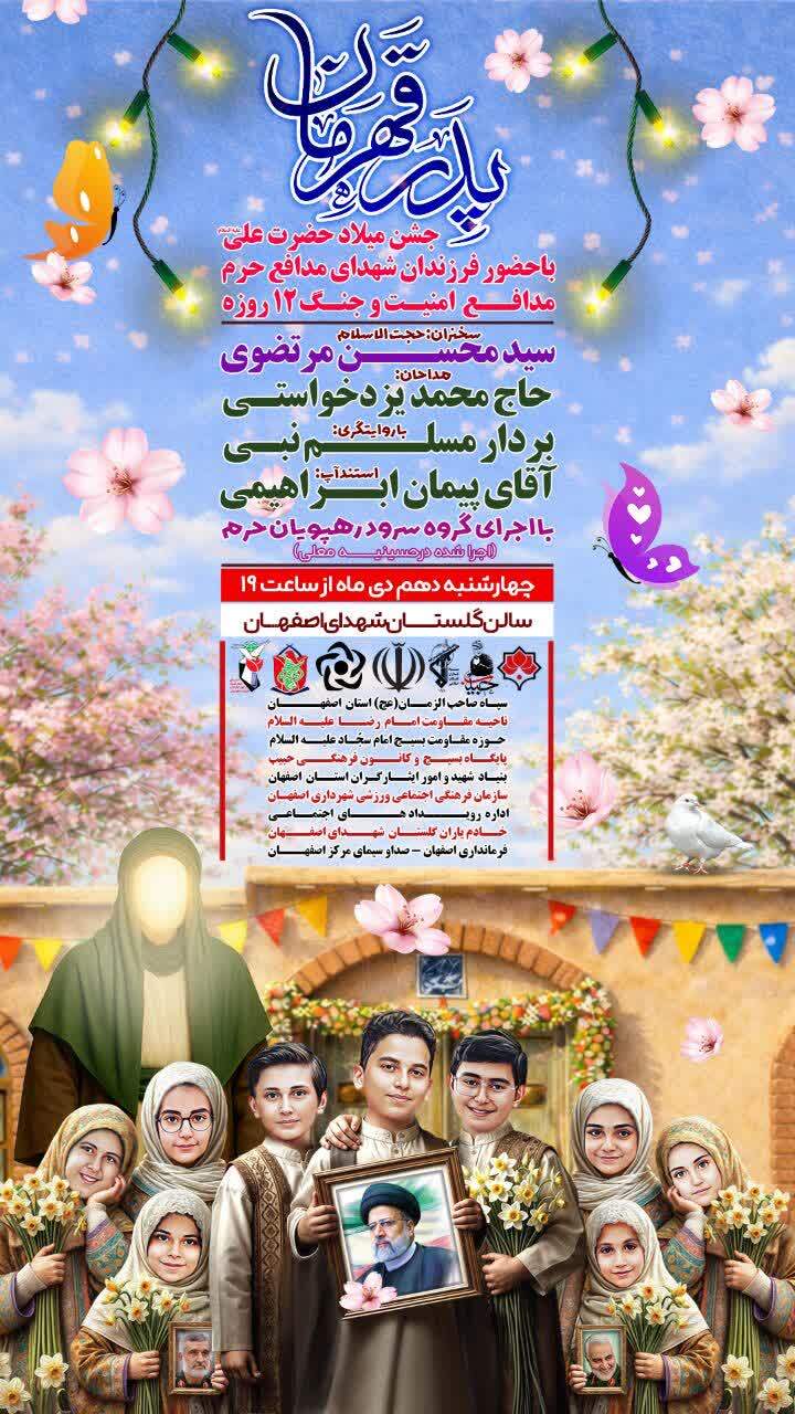 به گزارش نوید شاهد اصفهان، ویژهبرنامه «پدر قهرمان» همزمان با جشن میلاد حضرت علی علیهالسلام با حضور بیش از ۸۰ فرزند شهید مدافع حرم، امنیت و جنگ تحمیلی ۱۲ روزه، چهارشنبه ۱۰ دیماه ۱۴۰۴ از ساعت ۱۹ در سالن گلستان شهدای اصفهان برگزار خواهد شد.