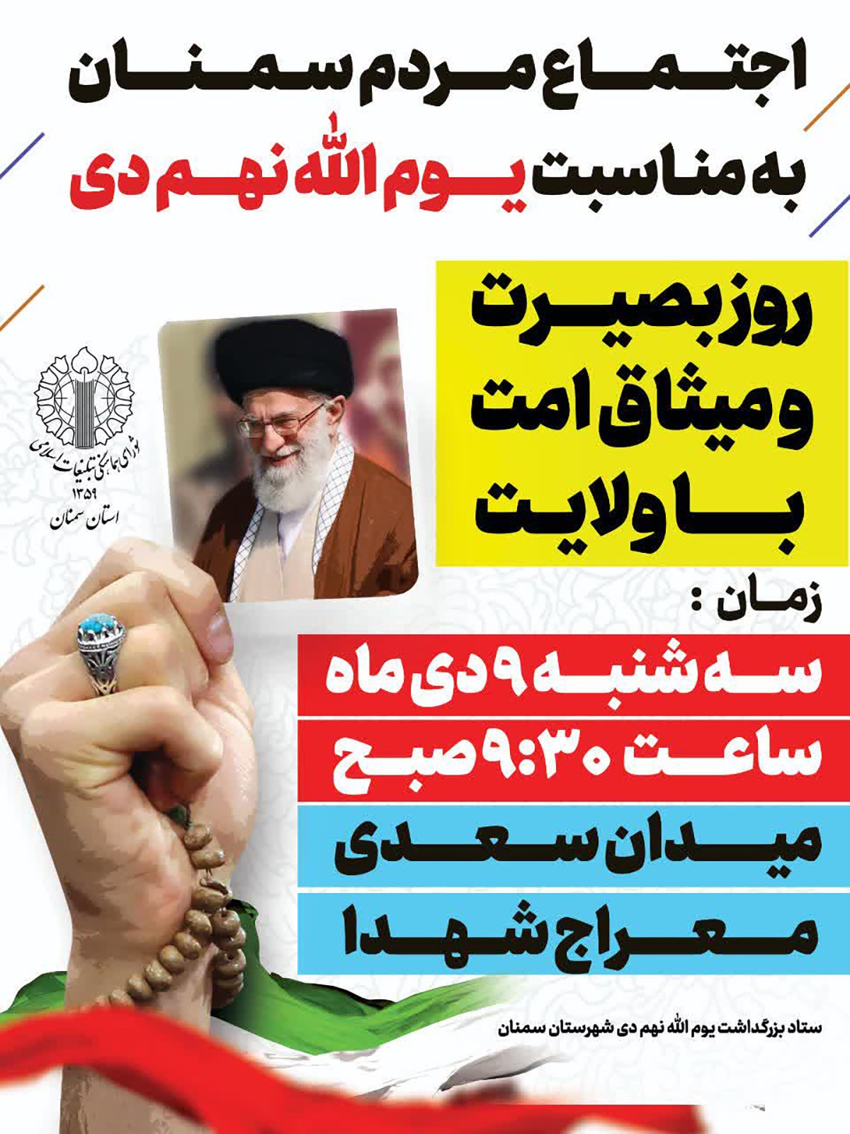اجتماع مردم شهرستان سمنان به مناسبت یومالله نهم دیماه؛ روز بصیرت و میثاق امت با ولایت، صبح فردا همزمان با سراسر کشور برگزار میگردد.