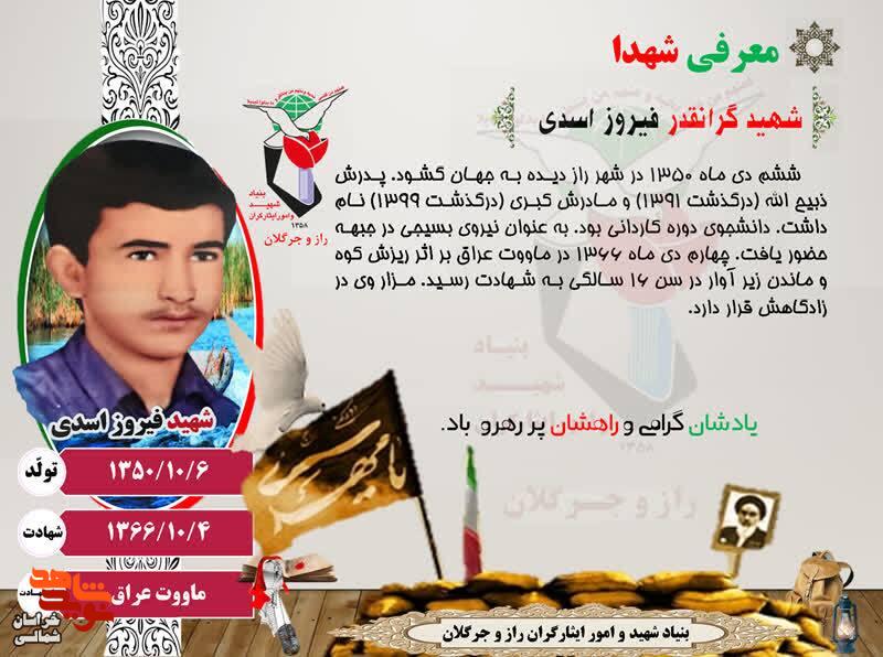 شهید «فیروز اسدی» در ۱۳۵۰ دیده به جهان گشود، او به عنوان نیروی بسیجی در جبهه حضور یافت و در چهارم دی ماه ۱۳۶۶ به شهادت رسید.