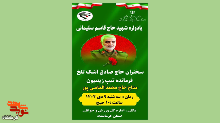 مراسم یادواره سردار سپهبد شهید حاج قاسم سلیمانی، سه‌شنبه نهم دی‌ماه ۱۴۰۴ ساعت ۱۰ صبح با سخنرانی «حاج صادق اشک‌تلخ» و مداحی «حاج محمد الماسی‌پور» در اداره کل ورزش و جوانان استان کرمانشاه برگزار خواهد شد.