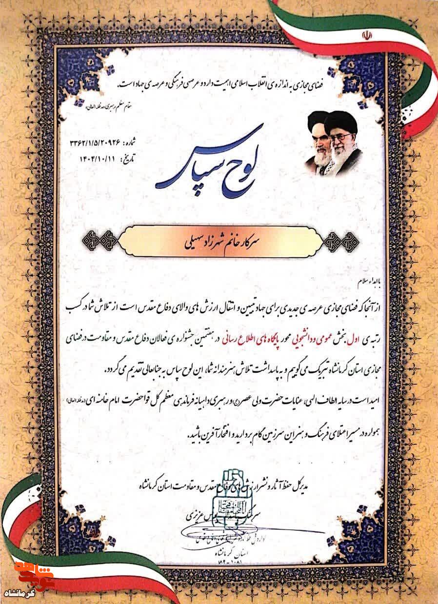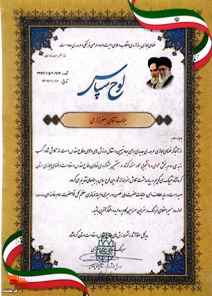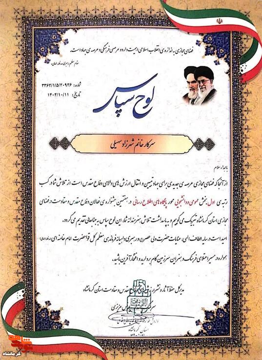 کسب رتبههای برتر توسط «جعفر زارعی» و «شهرزاد سهیلی» در هفتمین جشنواره فعالان دفاع مقدس و مقاومت در فضای مجازی، جلوهای از تلاش مؤثر فعالان فرهنگی و رسانهای استان کرمانشاه است.