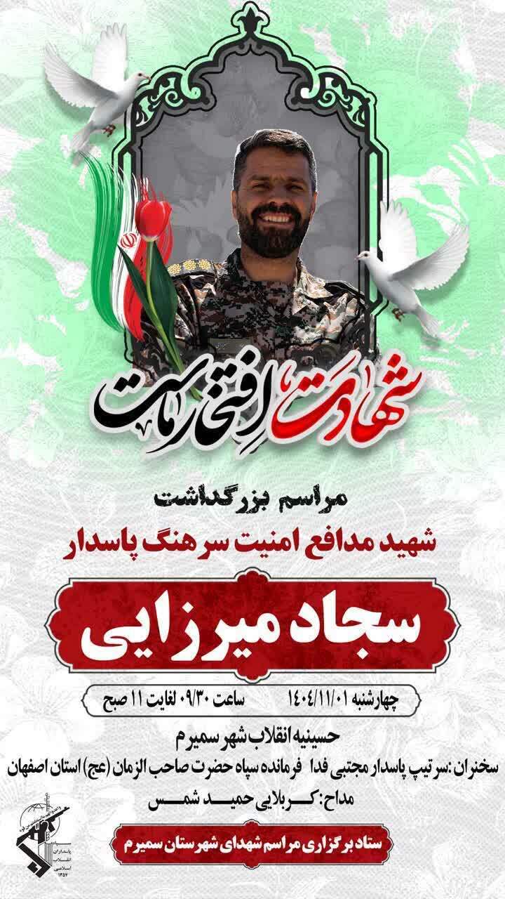 مراسم بزرگداشت شهید مدافع امنیت سرهنگ پاسدار «سجاد میرزایی» با سخنرانی سرتیپ پاسدار مجتبی فدا، فرمانده سپاه حضرت صاحبالزمان (عج) استان اصفهان یکم بهمن ۱۴۰۴ از ساعت ۹:۳۰ در حسینیه انقلاب شهر سمیرم برگزار می شود.
