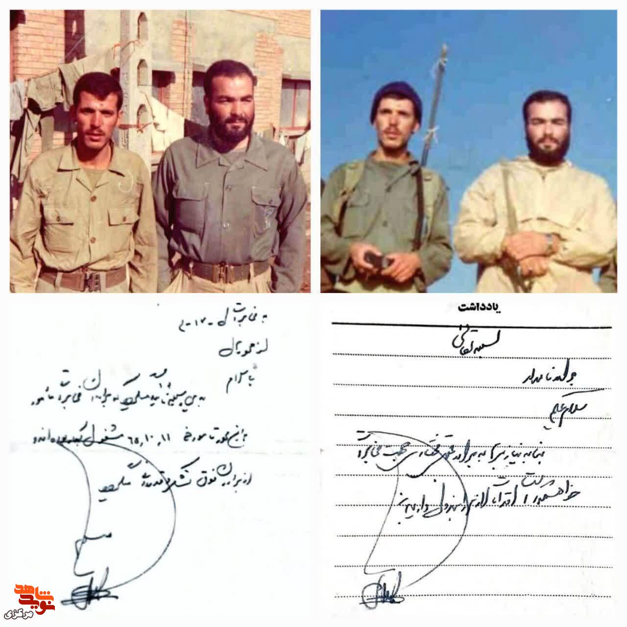 قاب خاطرهای که امروز روایت میشود، مزین است به تصویر سردار شهید آقا کاوه نبیری در کنار مجتبی مختاری، بیسیمچی او در گردان و محور عملیاتی. در بخش پایینی این قاب، نمونهای از همان امضای معروف دیده میشود؛ امضایی که برای درخواست امکانات مخابراتی از لشکر و متقابلاً تأیید محور به مخابرات ثبت شده است. دستخط مبارک و ارزشمند سردار، به گفته راوی، همچنان موجود است و بهعنوان سندی زنده از آن روزها حفظ شده است.