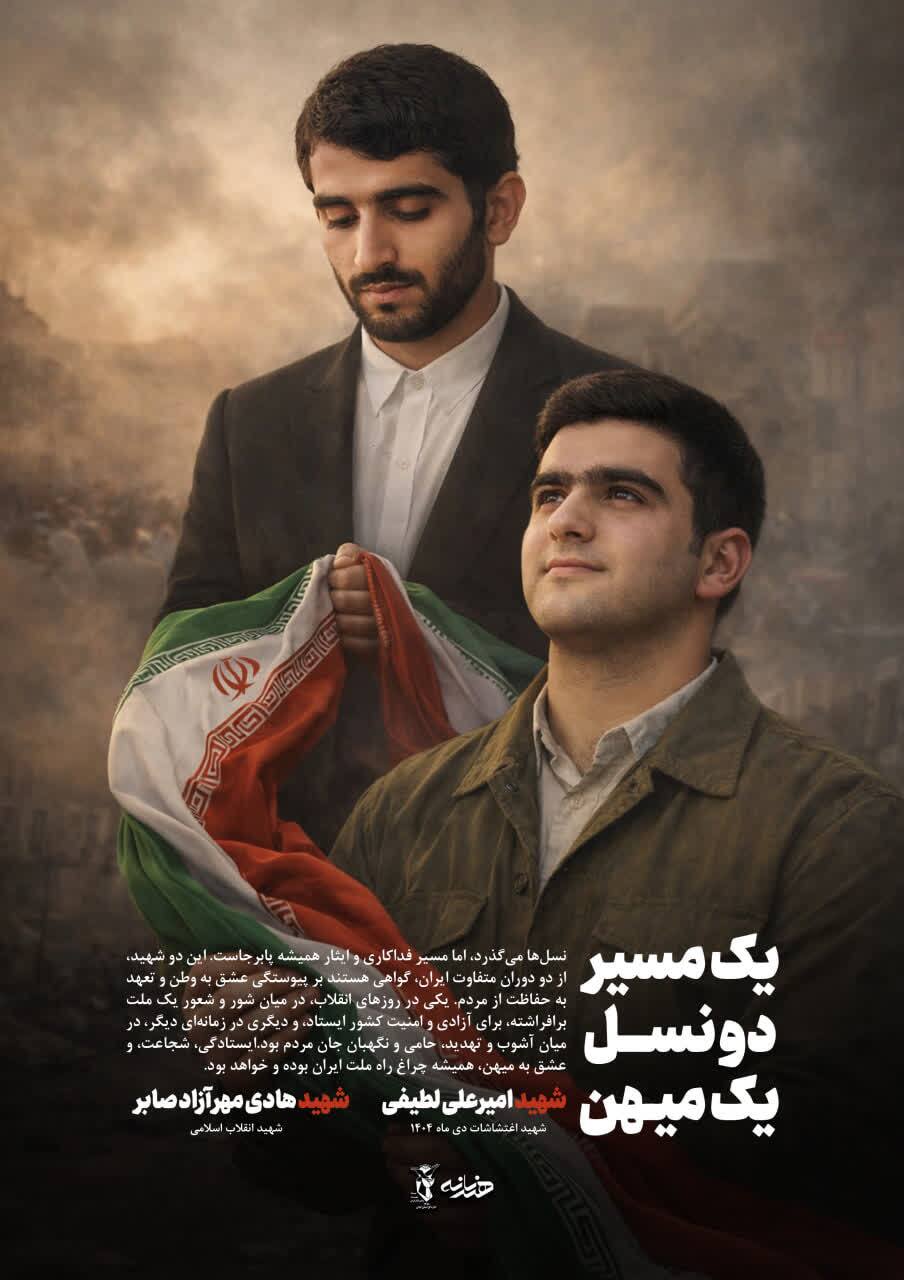 پوستر هنری با عنوان «یک مسیر، دو نسل، یک میهن» منتشر شد که به تصویرکشی پیوند عمیق میان نسلهای مختلف انقلاب اسلامی میپردازد. این اثر هنری با مقایسه ایستادگی شهیدان انقلاب در روزهای شور و شعور ملت و شجاعت شهیدان امنیت امروز که حامی و نگهبان جان مردم هستند، پیامی جاودانه را منتقل میکند: اینکه گذر زمان و تغییر نسلها هیچگاه نمیتواند راه فداکاری، عشق به میهن و پاسداری از امنیت کشور را تغییر دهد و این ارزشها همواره چراغ راه ملت ایران باقی خواهد ماند.