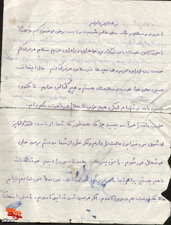 اینجانب حسین، بحمدالله خوب و سالم هستم و هیچگونه کسالتی ندارم. تاکنون چندین نامه نوشتهام، لیکن تا به حال هیچ پاسخی دریافت نکردهام. خواهش میکنم جواب نامه را فوراً بنویسید؛ زیرا همانطور که شما از بابت دوری دلواپس میشوید، من نیز همین حال را دارم و اگر خطی از شما به دستم برسد، بسیار خوشحال میشوم.