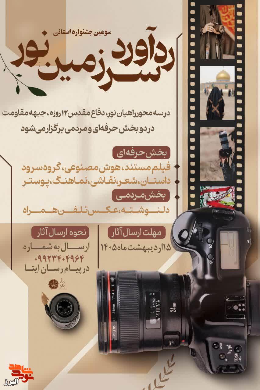 جشنواره هنری «ره‌آورد سرزمین نور» با محوریت راهیان نور، دفاع مقدس، و جبهه مقاومت، به همت سازمان اردویی راهیان نور سپاه امام حسن مجتبی(ع) استان البرز برگزار می‌شود و مهلت ارسال آثار تا ۱۵ اردیبهشت‌ماه ۱۴۰۵ است.