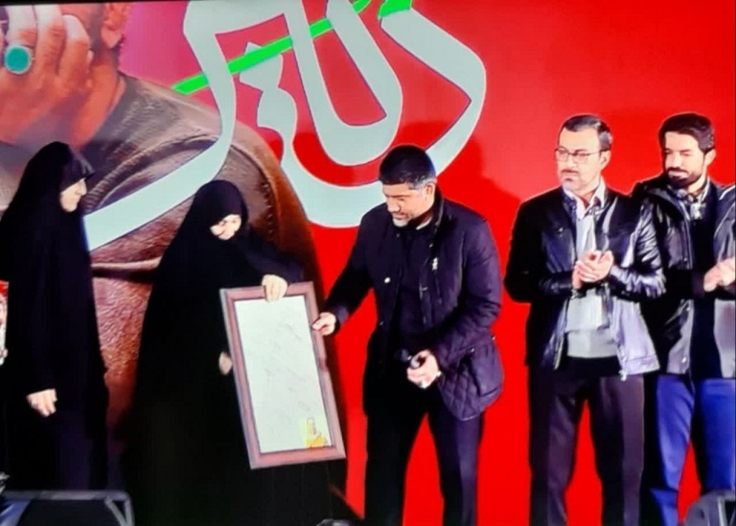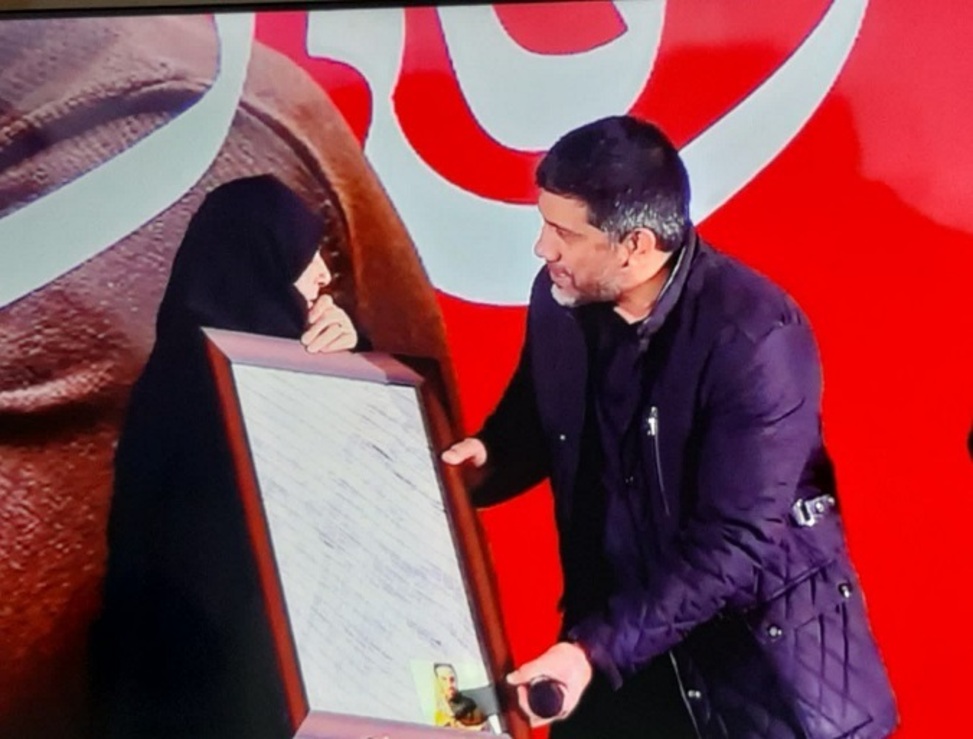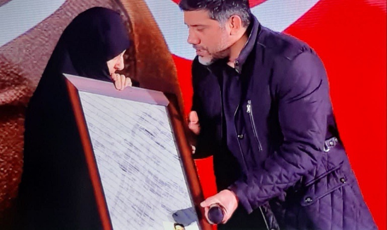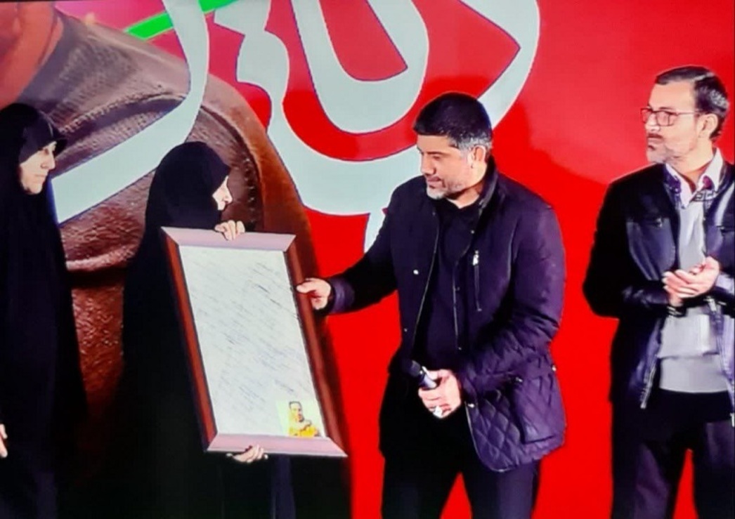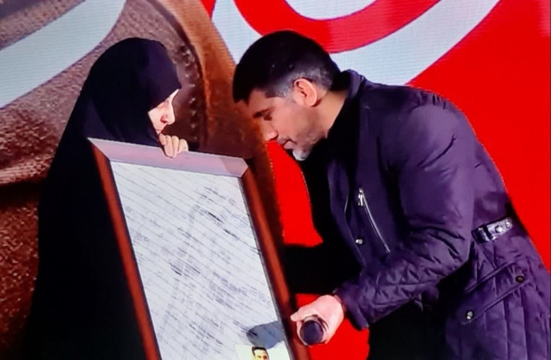 اهداء چفیه شهیدان خالقی پور توسط مادربزرگوارشان درجشنواره عمار به علیرضا دبیر