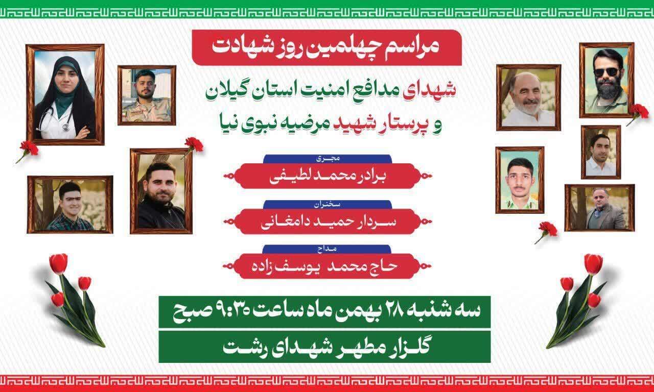 مراسم چهلمین روز شهادت شهدای مدافع امنیت استان گیلان و پرستار شهید مرضیه نبوی‌نیا، صبح سه‌شنبه ۲۸ بهمن در گلزار مطهر شهدای رشت برگزار می‌شود.