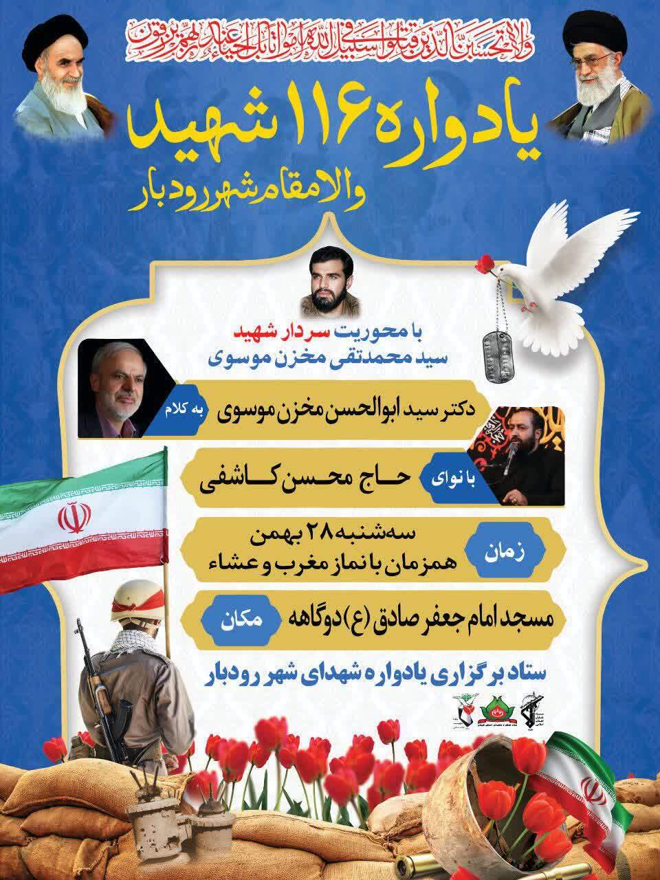 یادواره ۱۱۶ شهید والامقام شهر رودبار با محوریت سالگرد سردار شهید سید محمدتقی مخزن موسوی، سه‌شنبه ۲۸ بهمن‌ماه همزمان با نماز مغرب و عشاء برگزار می‌شود.