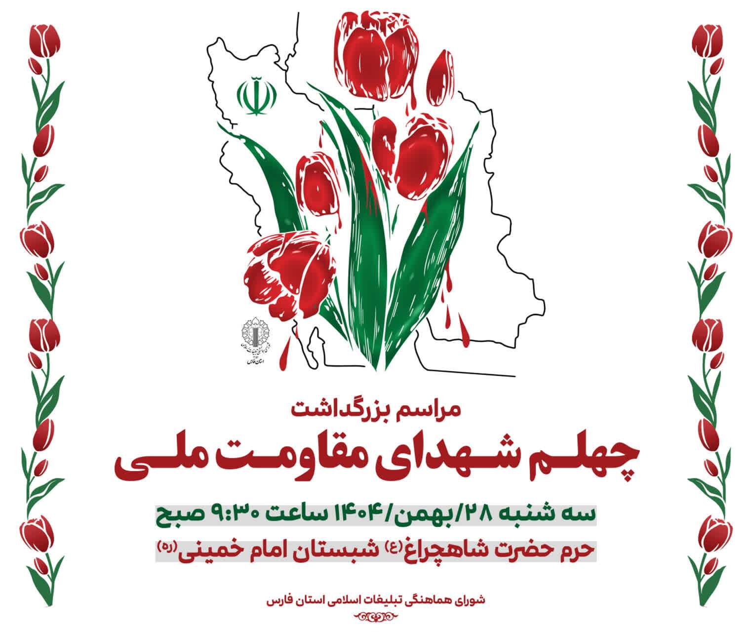 به گزارش نوید شاهد فارس، به‌منظور پاسداشت مقام شامخ شهدای فتنه آمریکایی و صهیونی، مراسم بزرگداشت چهلم این شهیدان والامقام، روز سه‌شنبه ۲۸ بهمن‌ماه ۱۴۰۴، ساعت ۹:۳۰ صبح در حرم مطهر حضرت شاهچراغ (ع)، شبستان امام خمینی (ره) برگزار می‌شود.