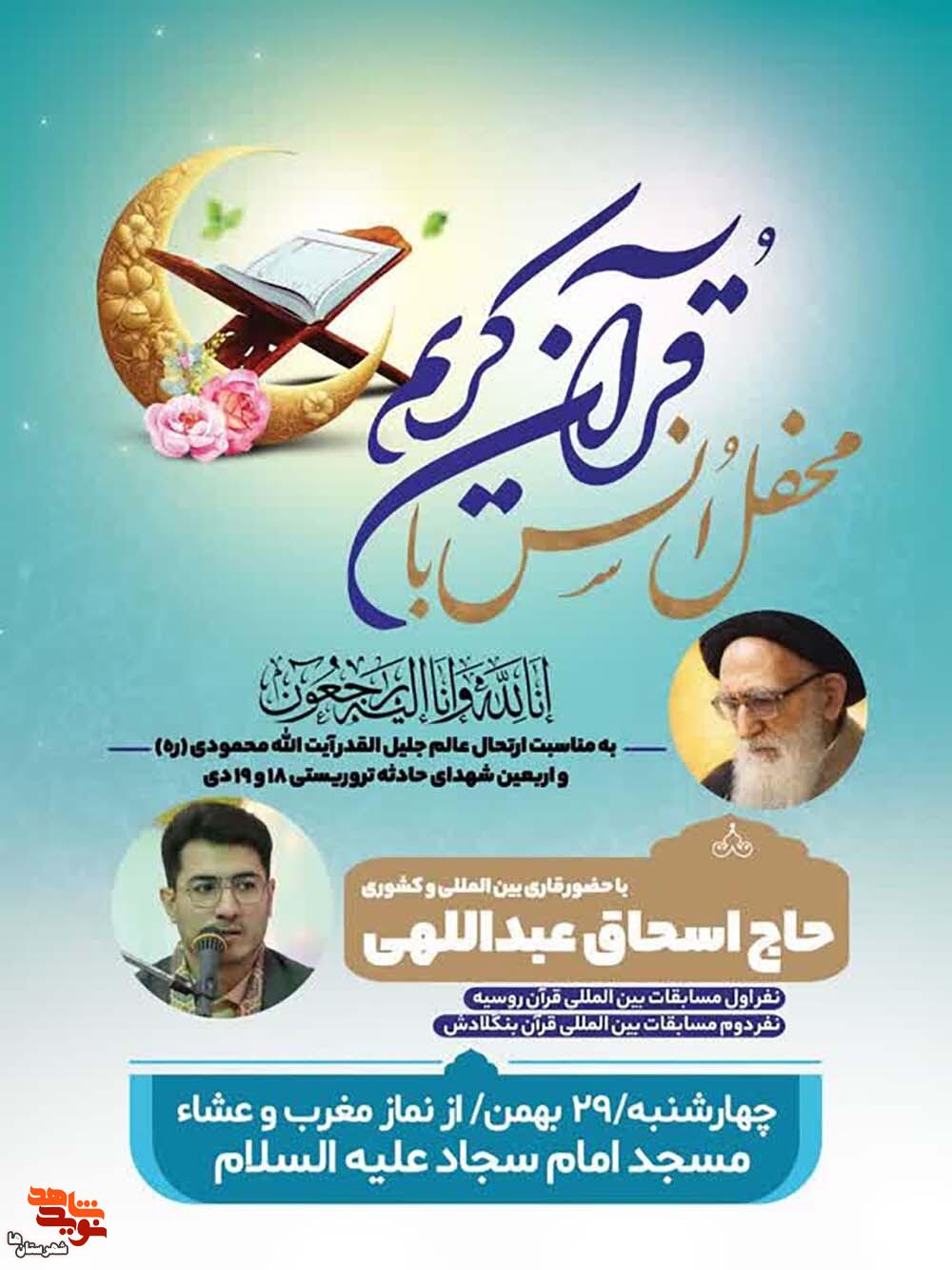 محفل اُنس قرآن کریم به همراه اربعین شهدای مظلوم وطن و مراسم ارتحال آیت‌الله سیدمرتضی محمودی گلپایگانی روز چهارشنبه ۲۹ بهمن همزمان با نماز مغرب و عشاء در مسجد امام سجاد(ع) شهرستان ورامین برگزار می‌شود.