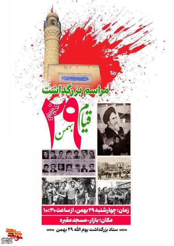 به گزارش نوید شاهد آذربایجان شرقی، در اطلاعیه شورای هماهنگی تبلیغات اسلامی استان آذربایجانشرقی آمده است: مراسم گرامیداشت قیام تاریخی ۲۹ بهمن مردم تبریز، با حضور اقشار مختلف مردم متدین و ولایتمدار، خانوادههای معظم شهدا و جمعی از مسئولان، روز چهارشنبه ۲۹ بهمنماه از ساعت ۱۰:۳۰ صبح در مسجد مقبره تبریز برگزار میشود.