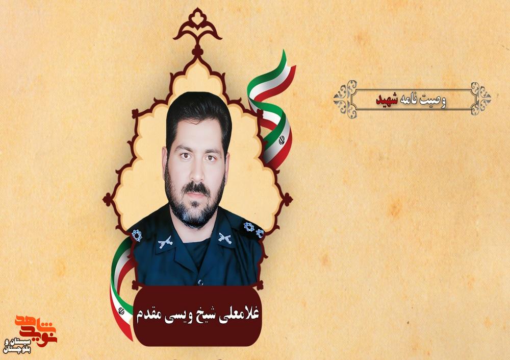 اینجانب غلامعلی شیخ ویسی مقدم فرزند محمد امیر، مطابق هر سال در نخستین روزهای سال نو وصیت نامه ای جدید را می نویسم و این کار حداقل حسنی که دارد این است که به یک سال گذشته می اندیشم و لحظه لحظه ساعات و دقایق را در ذهن مرور می نمایم در آغاز خداوند را شکر می نمایم که یک سال دیگر را در کمال صحت و سلامت در کنار همسر و فرزندانم با تمام شادی ها و غم هایش سپری کرده ام و رشد فرزندانم ثمره زندگیم را به چشم می بینم و زا سوی دیگر لااقل این حسن را دارد که به اعمال گذشته ام می اندیشم تا اگر خدای نکرده حقی را پایمال کرده باشم به صاحبش باز گردانم و حلالیت بطلبم و خوشحالم که تا این تاریخ مدیون کسی نیستم به جز همسر فداکار صبورم و فرزندان دلبندم چرا که بیشتر سال را دور از آنها گذرانده ام و امیدوارم پس از این بتوانم دینم را در حق آنان ادا نمایم و اگر به هر دلیلی اعم از مرگ و بستر بیماری یا تصادف و یا در درگیری با اشرار و قاچاقچیان در وطن شهید شدم که بارها و بارها از پروردگارم خواسته ام که اگر اجل من فرا رسد مرگی با عزت و شرف نصيب من نماید و چه عزتی بالاتر از شهادت (آمین یا رب العالمین) امیدوارم فرزندانم از همه دوستان و آشنایان و اهل فامیل و همکاران عزیزم حلالیت بگیرند و اگر کسی حقی بر من داشت حقش را ادا نماید.