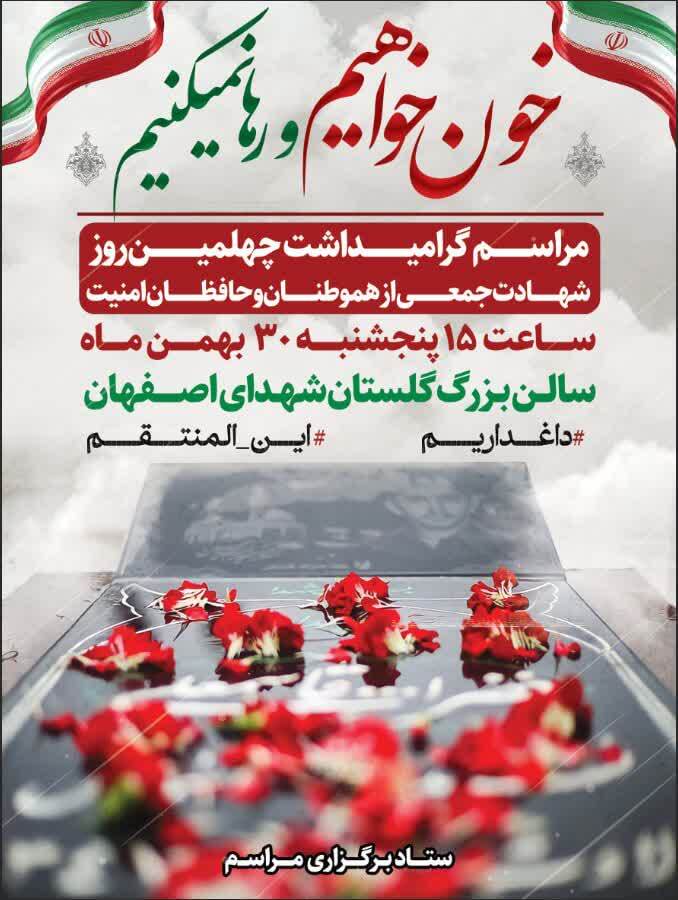 مراسم گرامیداشت چهلمین روز شهادت جمعی از هموطنان و حافظان امنیت، روز پنجشنبه ۳۰ بهمن ۱۴۰۴ از ساعت ۱۵ در سالن گلستان شهدای اصفهان برگزار خواهد شد.