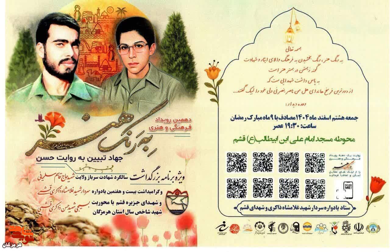 دهمین رویداد فرهنگی و هنری به رنگ هنر در محوطه مسجد امام علی ابنابیطالب (ع) قشم روز جمعه ۸ اسفند ماه از ساعت ۱۹:۳۰ برگزار میشود.