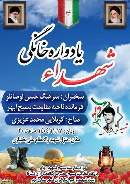 یادواره خانگی شهید علی بختیاری در ابهر برگزار میشود
