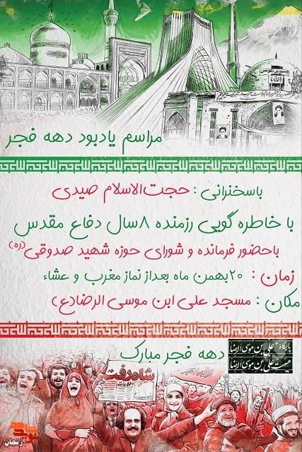 مراسم یادبود ایام‌الله دهه فجر با سخنرانی حجت‌الاسلام صیدی و خاطره‌گویی رزمنده هشت سال دفاع مقدس، فردا دوشنبه ۲۰ بهمن‌ماه در مسجد علی‌ابن‌موسی‌الرضا (ع) برگزار می‌شود.