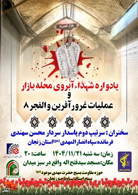 به گزارش نوید شاهد زنجان، در آستانه گرامیداشت یاد و خاطره شهدا، یادواره شهدای «آبروی محله بازار» همراه با بزرگداشت عملیات غرورآفرین عملیات والفجر ۸ روز سهشنبه ۲۱ بهمنماه ساعت ۲۰ در مسجد سید فتحاله واقع در سبزهمیدان برگزار خواهد شد.