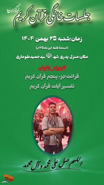 جلسه یادشده در منزل پدری شهید حمید طوماری برگزار میشود و با تلاوت آیات نورانی قرآن کریم، ذکر و دعا و یادآوری سیره اخلاقی و معنوی شهدا همراه خواهد بود. این محفل قرآنی فرصتی برای تجدید میثاق با آرمانهای شهدا و بهرهمندی از فضای معنوی خانهای است که به برکت نام و یاد شهید، مأمن انس با کلام وحی شده است.