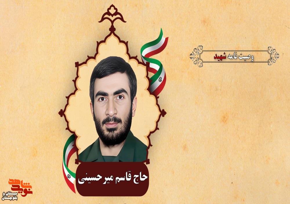 به گزارش نوید شاهد سیستان و بلوچستان، شهید «حاج قاسم میرحسینی»، دوم مرداد 1342، در روستای جزینک از توابع شهرستان زهک به دنیا آمد. پدرش مرادعلی، کشاورز بود و مادرش شهربانو نام داشت. تا پایان دوره متوسطه درس خواند و دیپلم گرفت. سال 1361 ازدواج کرد. به عنوان پاسدار در جبهه حضور یافت. نوزدهم دی ماه 1365، با سمت معاون فرمانده لشکر 41 ثارالله در شلمچه بر اثر اصابت ترکش به سر، شهید شد. مزار او در گلزار شهدای زادگاهش قرار دارد. برادرش غلامحسن نیز به شهادت رسیده است.